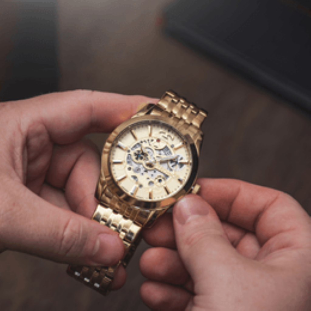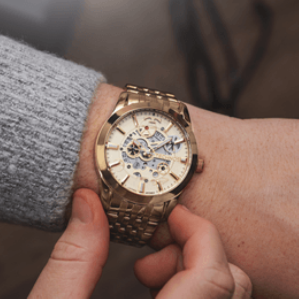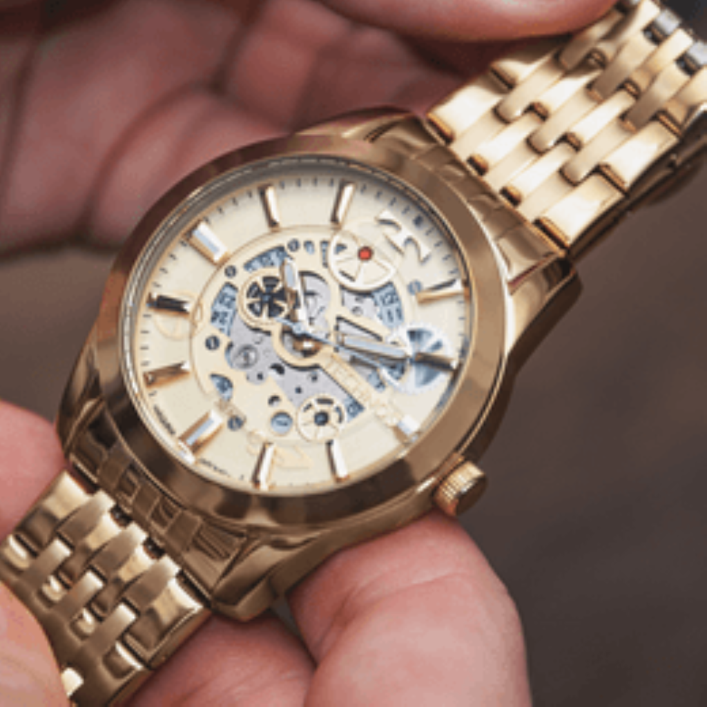 Este relógio automático possui caixa de 4,6 cm e se destaca pelo seu mostrador vazado, que permite enxergar o maquinismo por diversos ângulos. Além disso, o modelo possui fundo transparente, caixa e pulseira de aço dourado e calendário. Resistência à água até 50 m