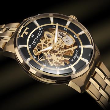 O Relógio Technos Automático masculino é um modelo com fundo de vidro no mostrador, em que seu maquinismo automático fica visível. Sua caixa e pulseira de aço em banho dourado fazem o contraste perfeito com o mostrador de cor preta. Possui tamanho de caixa 46mm e resistência à água de 5 ATM.