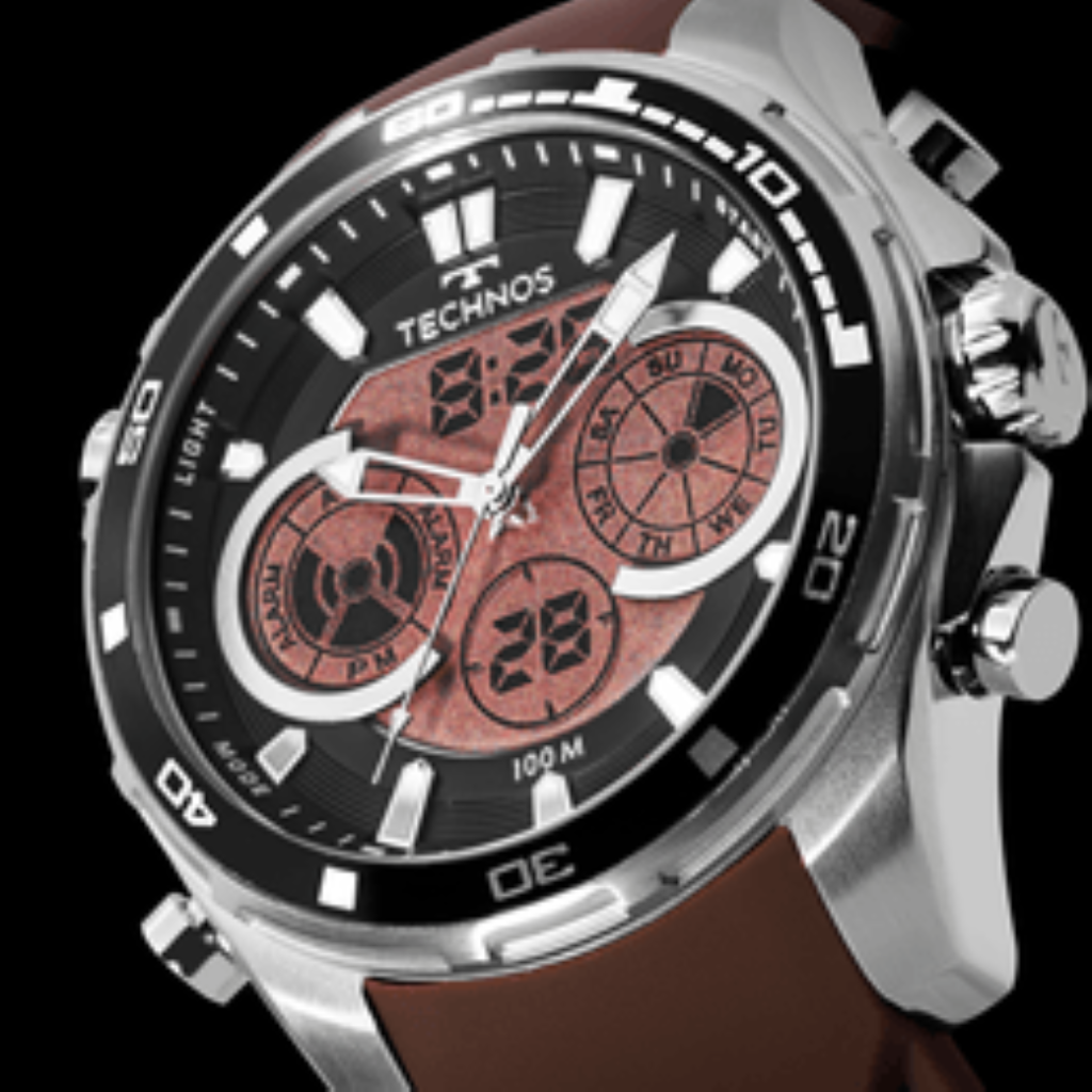 A linha DigiTech apresenta um modelo inédito, com estética esportiva, aplicação de alumínio no aro externo e acabamento escovado. Unindo dois maquinismos, seu diferencial está no display digital amplo e colorido, que faz um belo contraste com o banho do relógio. Produto 100% em aço inoxidável, com máquina anadigi, calendário, cronômetro, alarme, luz noturna e resistência à água de 100 metros. Versões com pulseira de aço em 3 links ou pulseira de silicone.